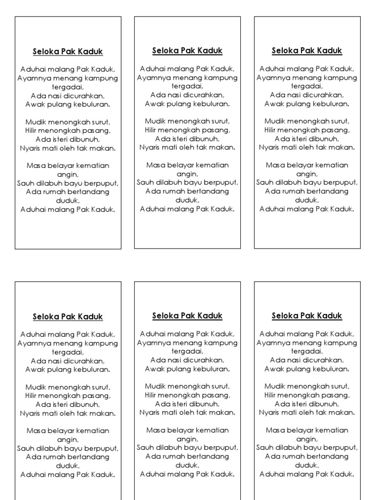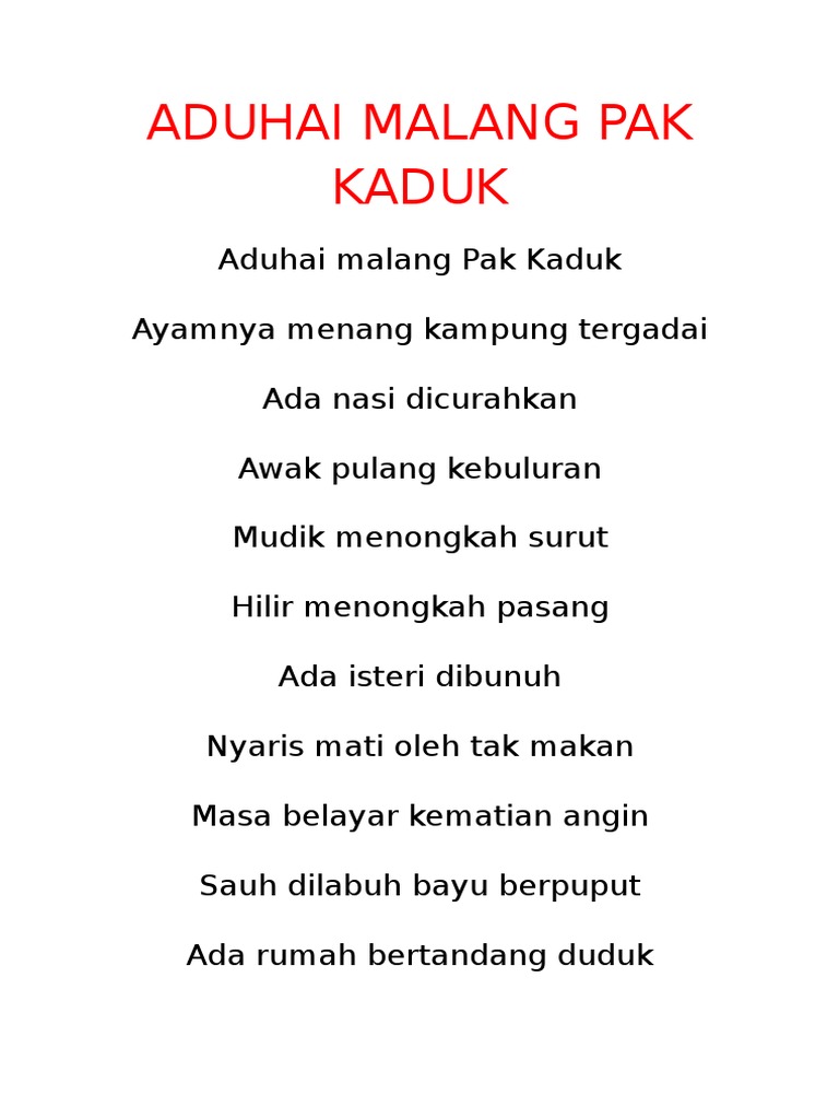 Nasi yang ada dibuang dan apabila balik dia kelaparan kerana tiada makanan. FOKUS BMSPM 2010 - PUISI SELOKA PAK KADUK. Stream AUDIO 63 LAGU SELOKA PAK KADUK NYANYIAN 2 SUARA by PENDIDIKAN MUZIK TINGKATAN 3 on desktop and mobile.